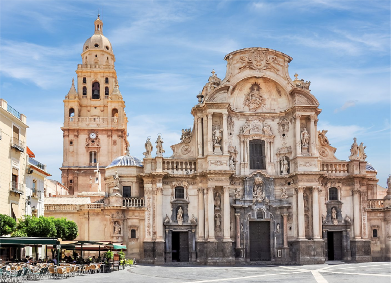 Uno de los imprescindibles es la Catedral de Murcia , con su impresionante campanario de 93 metros de altura, situada en la Plaza Cardenal Belluga, donde se mezclan historia y modernidad. Otro lugar fascinante es el Real Casino de Murcia, un edificio con una decoración interior espectacular, especialmente su salón árabe. Para pasear y disfrutar del ambiente la Plaza de las Flores es ideal, con terrazas animadas y un toque muy murciano. Si te gusta la naturaleza, un paseo por el Malecón o una escapada a la Sierra de Carrascoy te ofrecerán aire fresco y vistas increíbles.